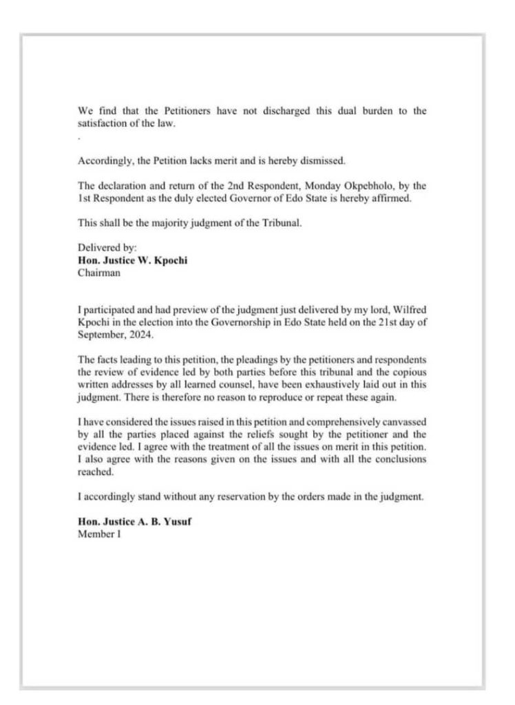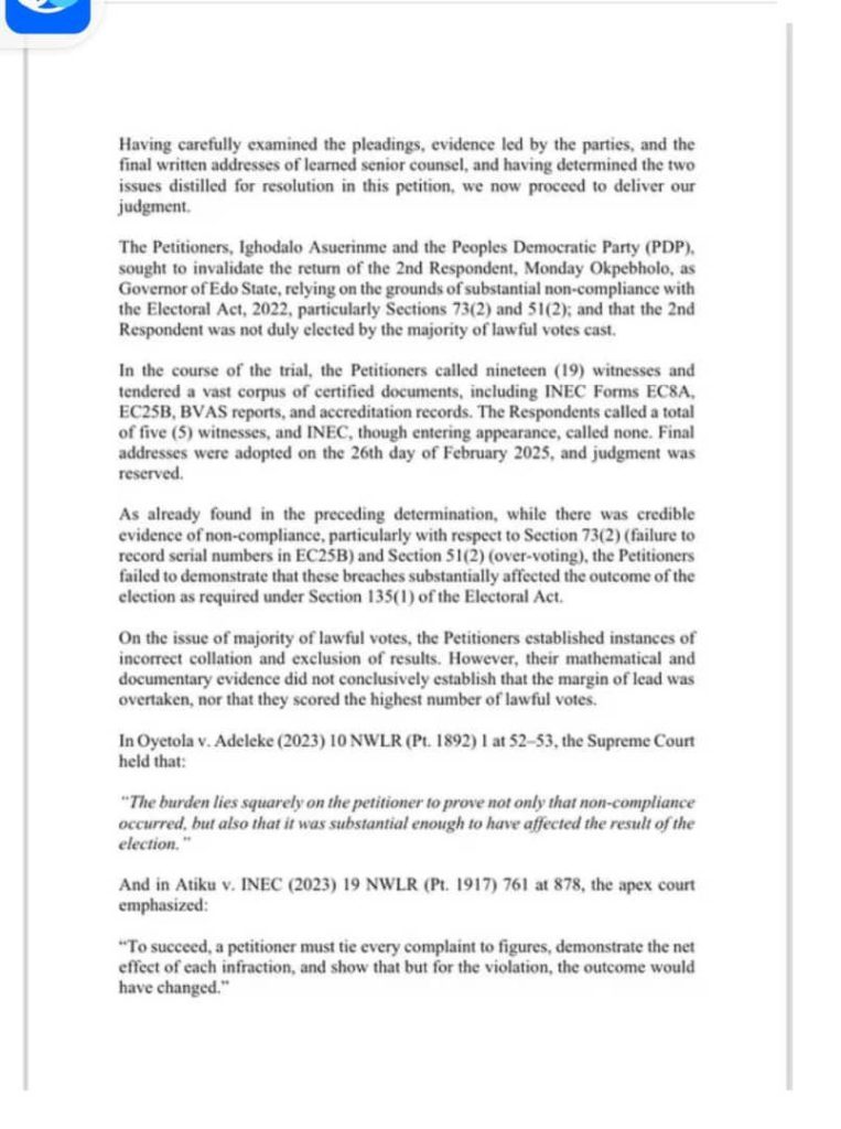 ....party releases leaked tribunal judgement, says nothing will stop Okpebholo from being declared winner